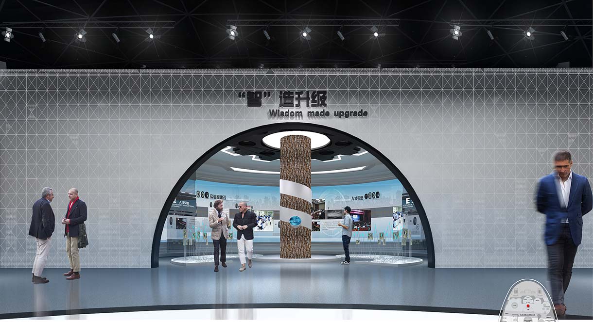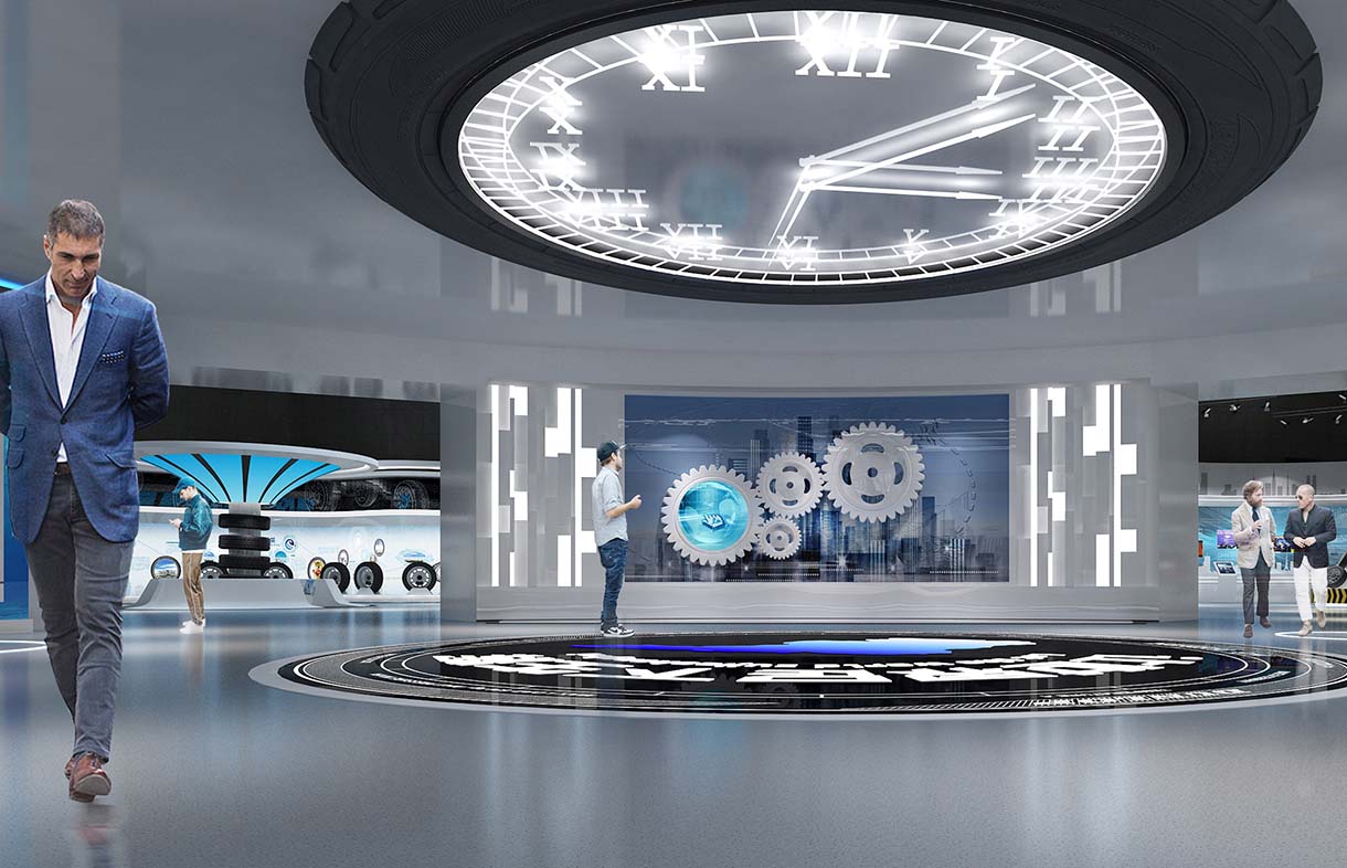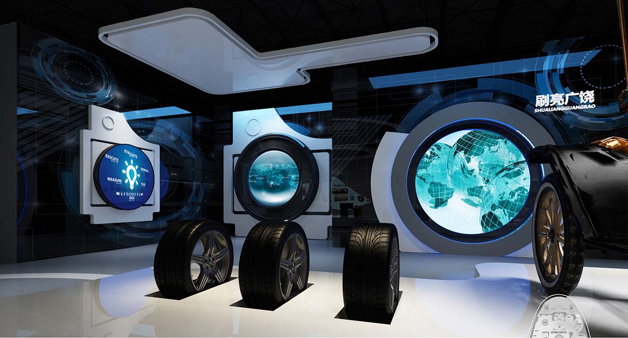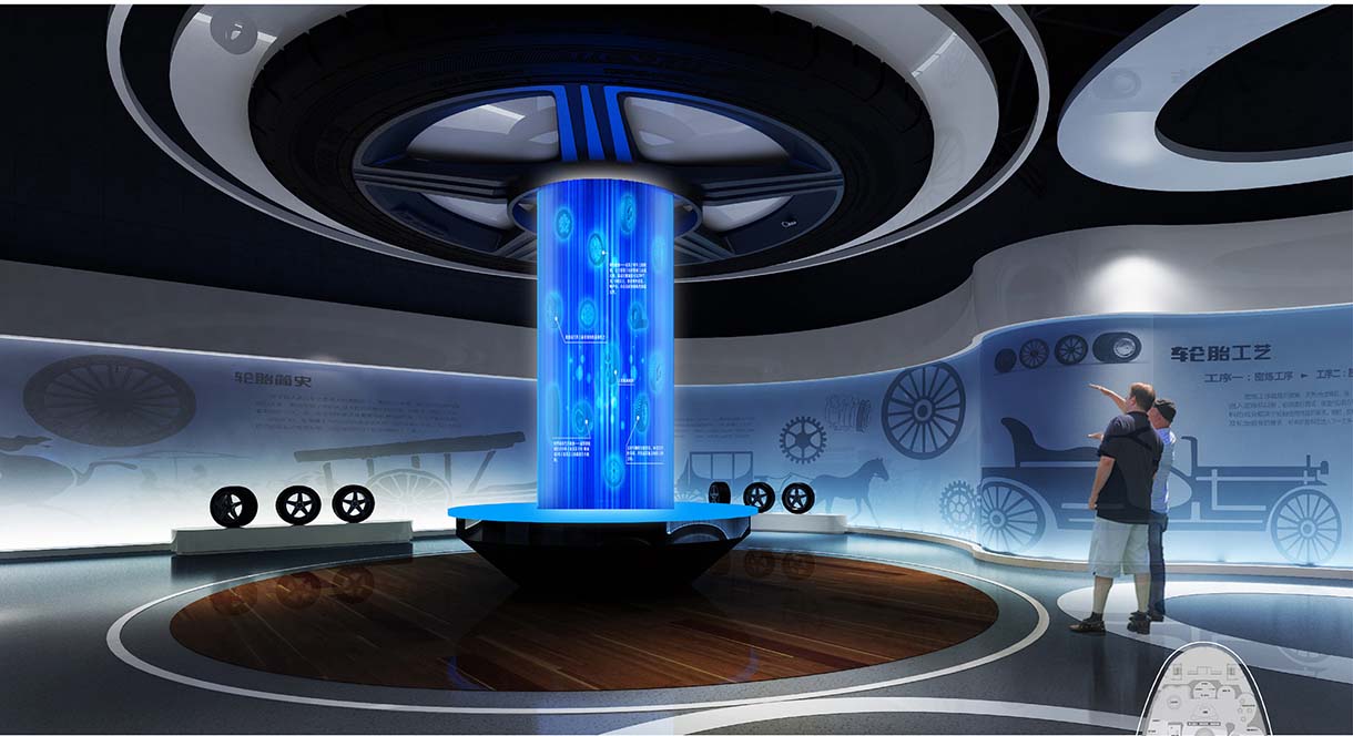 本次設(shè)計將嚴(yán)格圍繞輪胎這一元素,在展廳頂部和墻面運(yùn)用大量的輪胎元素,將參觀者帶入輪胎的世界。配合數(shù)字化展示項(xiàng)目將輪胎的發(fā)展歷程娓娓道來,以輕松愉悅的氛圍向大眾科普輪胎知識,加深大眾對于廣饒輪胎的印象。