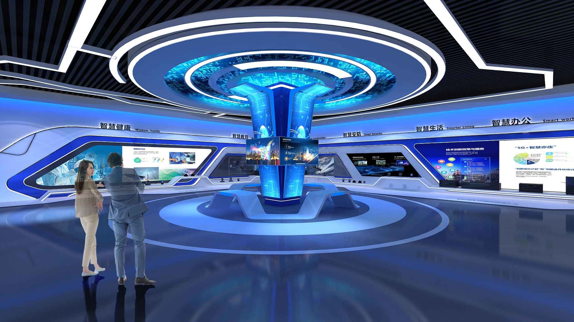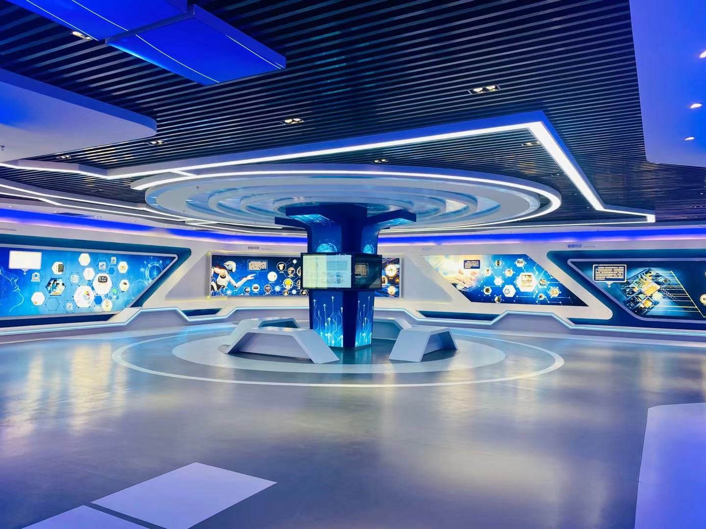 設計理念:各分展區又形成一種更符合本展區性質的色調,與其它展區色調有一定的區別性,合理的將頂、地、墻緊密銜接在一起。從展館的大范圍看,色調是和諧統一的科技藍色,各展區色調彼此之間延續一種順承、漸變的關系。在設計中嚴格把握色彩的運用形式,各展區之間既有統一性又有個性的變化,使之成為一種富有韻律的節奏性色彩關系。