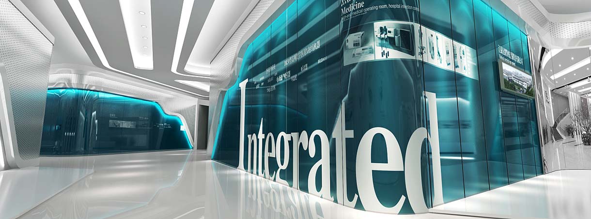 考慮到展示空間的藝術性,本次將采用拼接屏作為主要的展示工具,充分利用其造型的多變性來貼合展廳空間造型,同時搭配觸摸屏為展示空間加入一絲生氣,以一幅幅有感染力、吸引力的畫面來展現巨鯊多年來的研發成果。