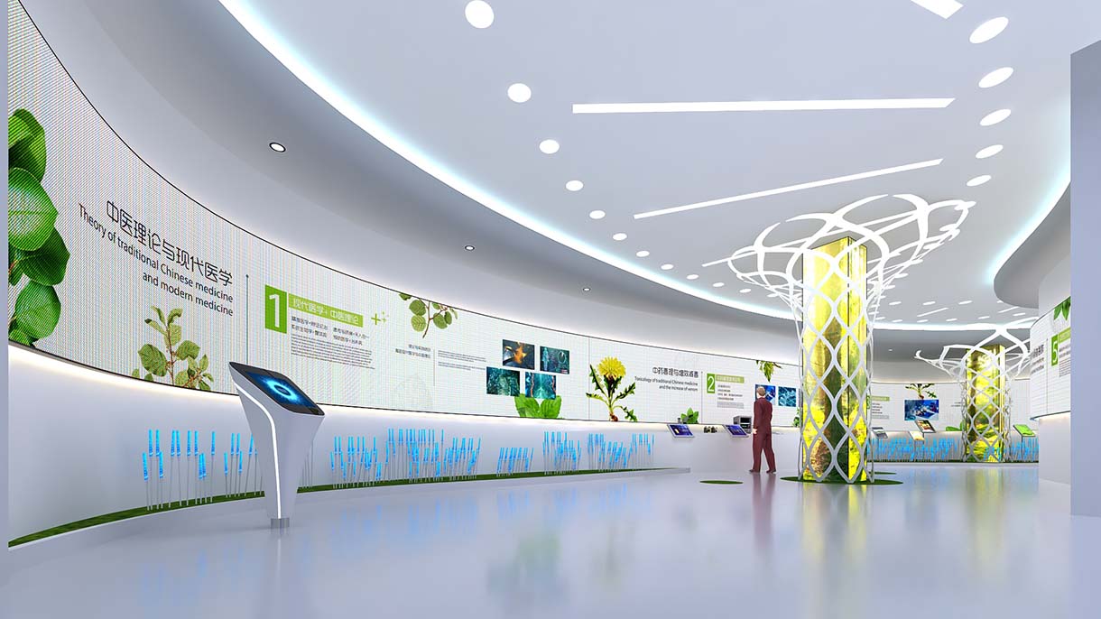 展廳設(shè)計(jì)策劃思路:整體空間簡(jiǎn)設(shè)計(jì)潔大氣,大立面大視角的圖文版面展陳康美20年來(lái)的發(fā)展業(yè)績(jī)。展區(qū)以象征生機(jī)的綠色與無(wú)限未來(lái)的白色為主要色調(diào),寓意著中醫(yī)藥健康發(fā)展的未來(lái)一片光明,選用淡雅溫柔的色調(diào)營(yíng)造出典雅的空間氛圍,貼合中醫(yī)藥文化的特性。