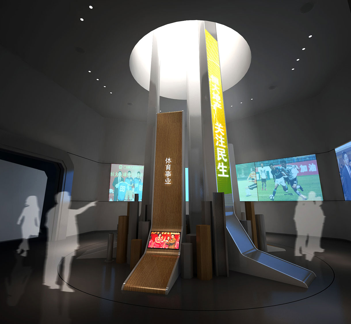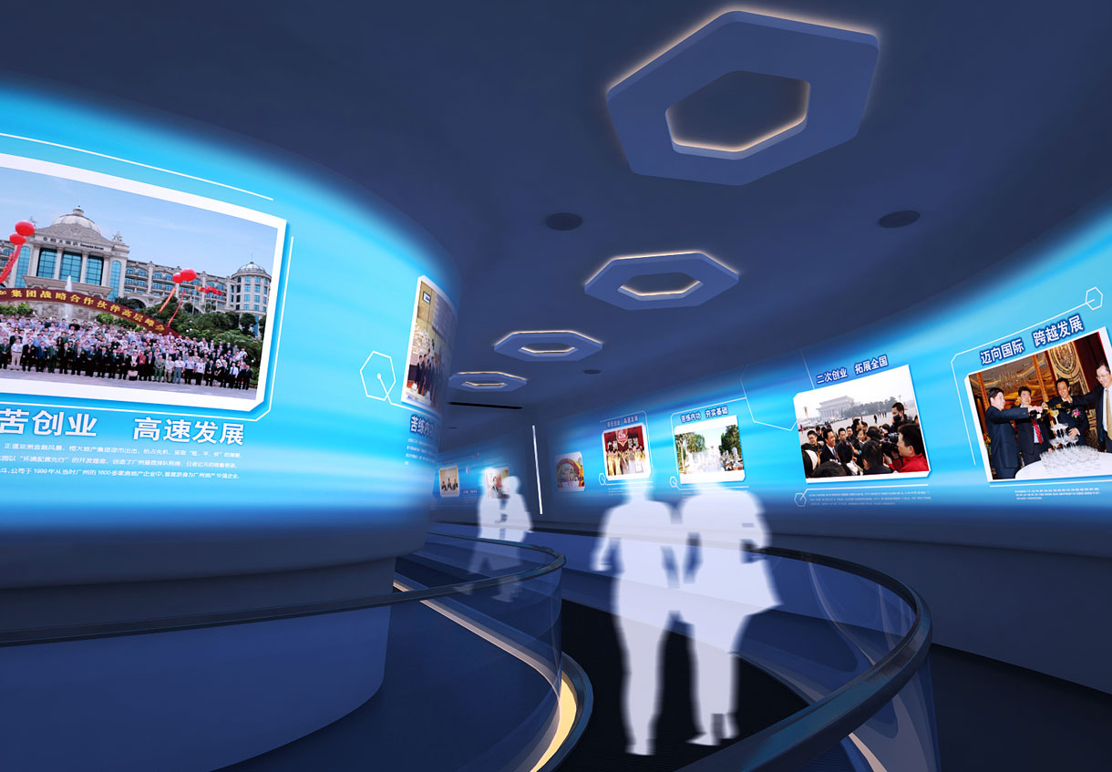 運用簡練的視覺元素,引導參觀者進入“恒大地產,關注民生”的展示主題,在運用的多媒體設備展示中呈現恒大的發展歷程,如:全面展現恒大集團的關鍵詞、碎片化的恒大歷史、恒大的諸多“第一”成就;并以新興科技效果讓參觀者感受到恒大的文化理念·。