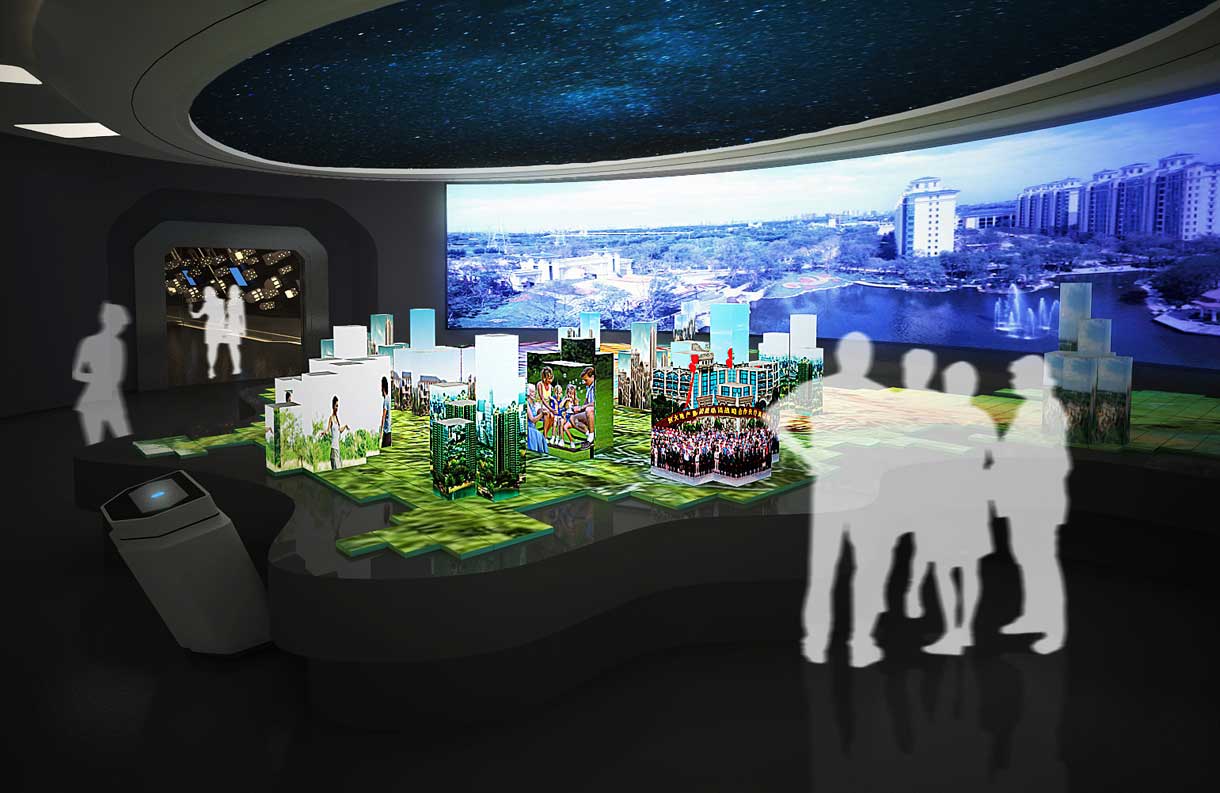 展廳多媒體展示形式:互動系統+數字沙盤+環幕投影+VR技術